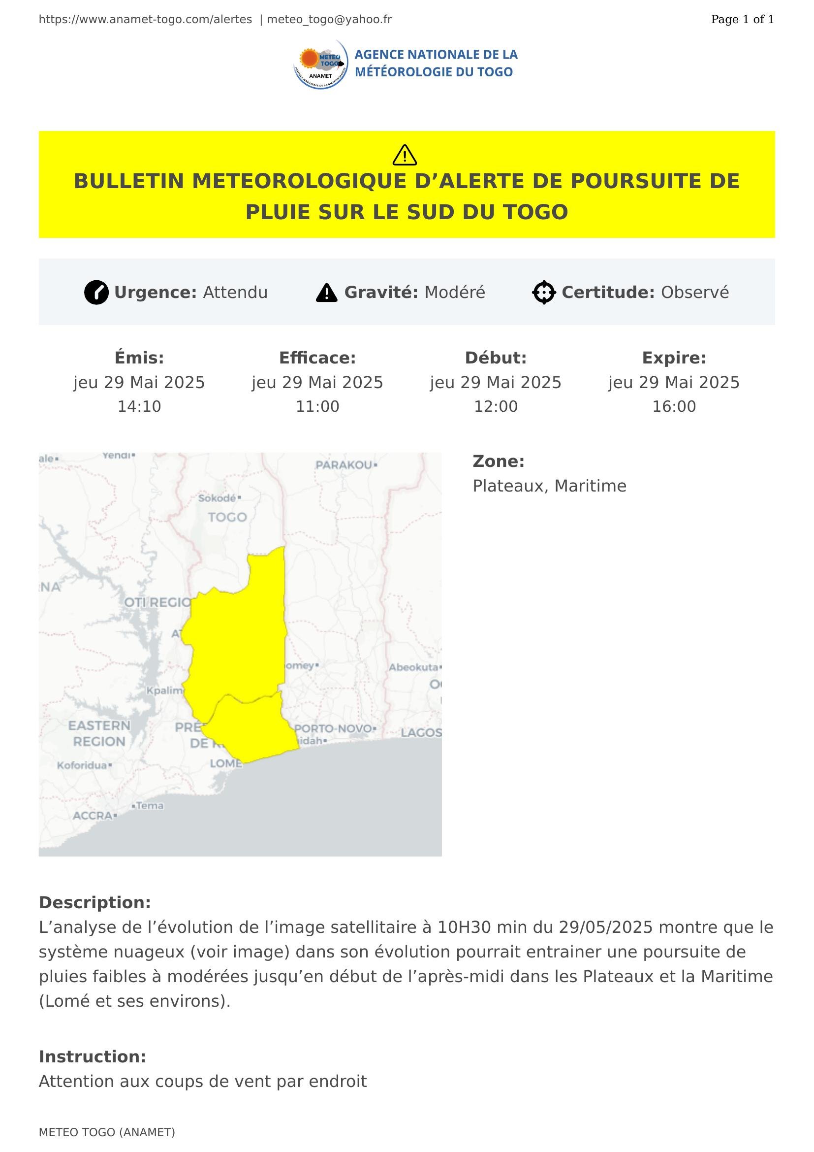 BULLETIN METEOROLOGIQUE D’ALERTE DE POURSUITE DE PLUIE SUR LE SUD DU TOGO
