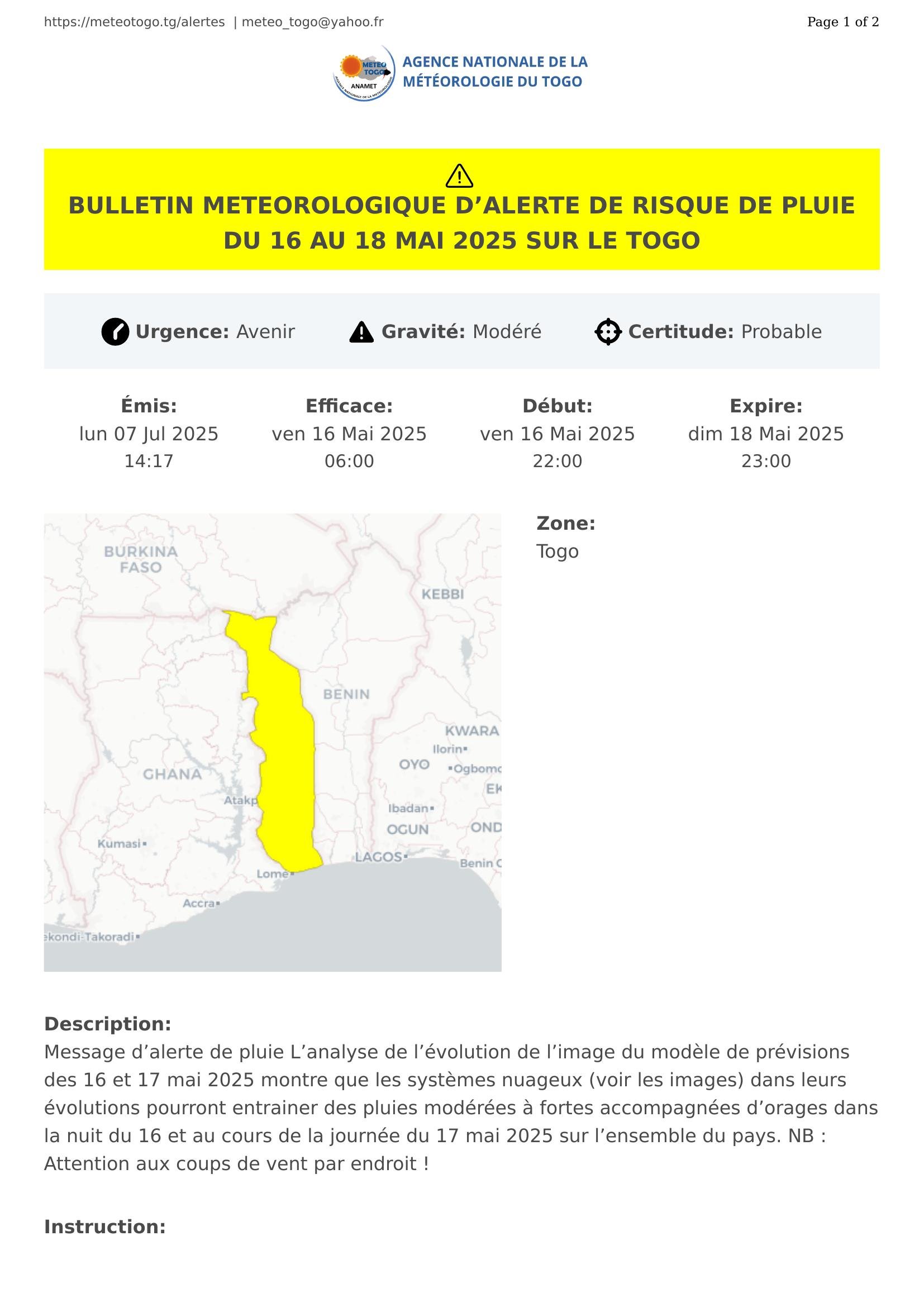 BULLETIN METEOROLOGIQUE D’ALERTE DE RISQUE DE PLUIE DU 16 AU 18 MAI 2025 SUR LE TOGO