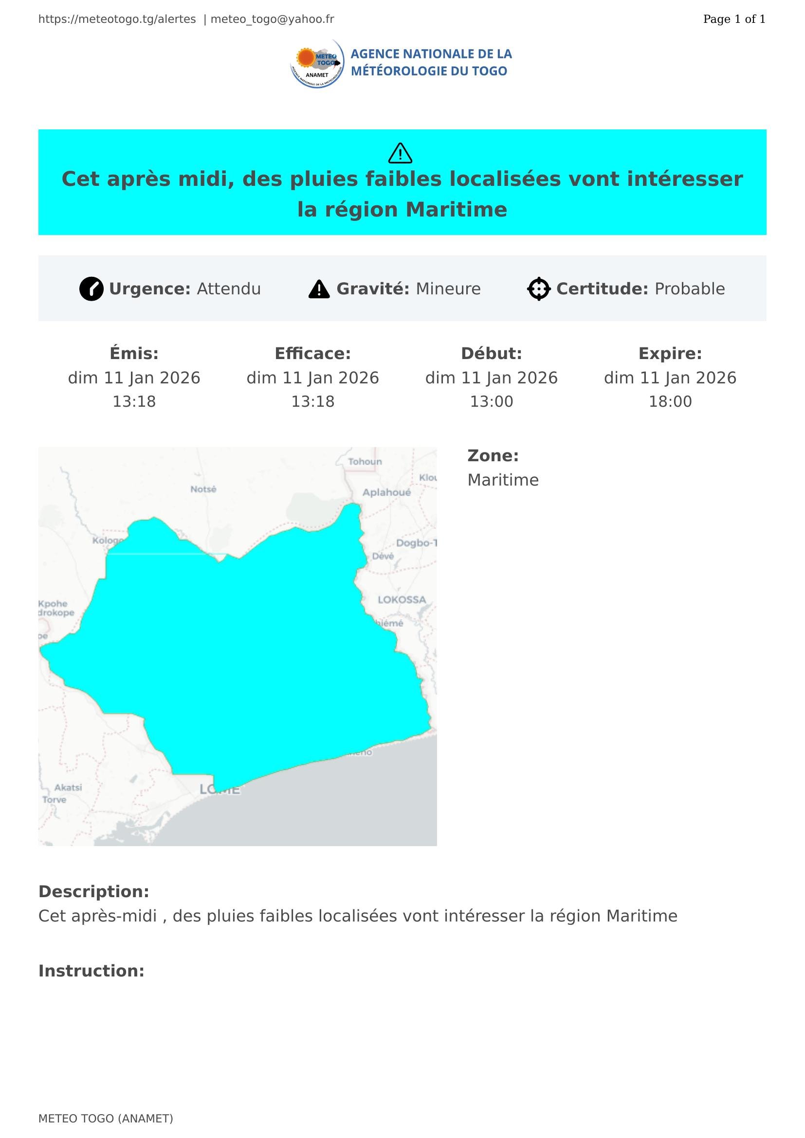 Cet après midi, des pluies faibles localisées vont intéresser la région Maritime