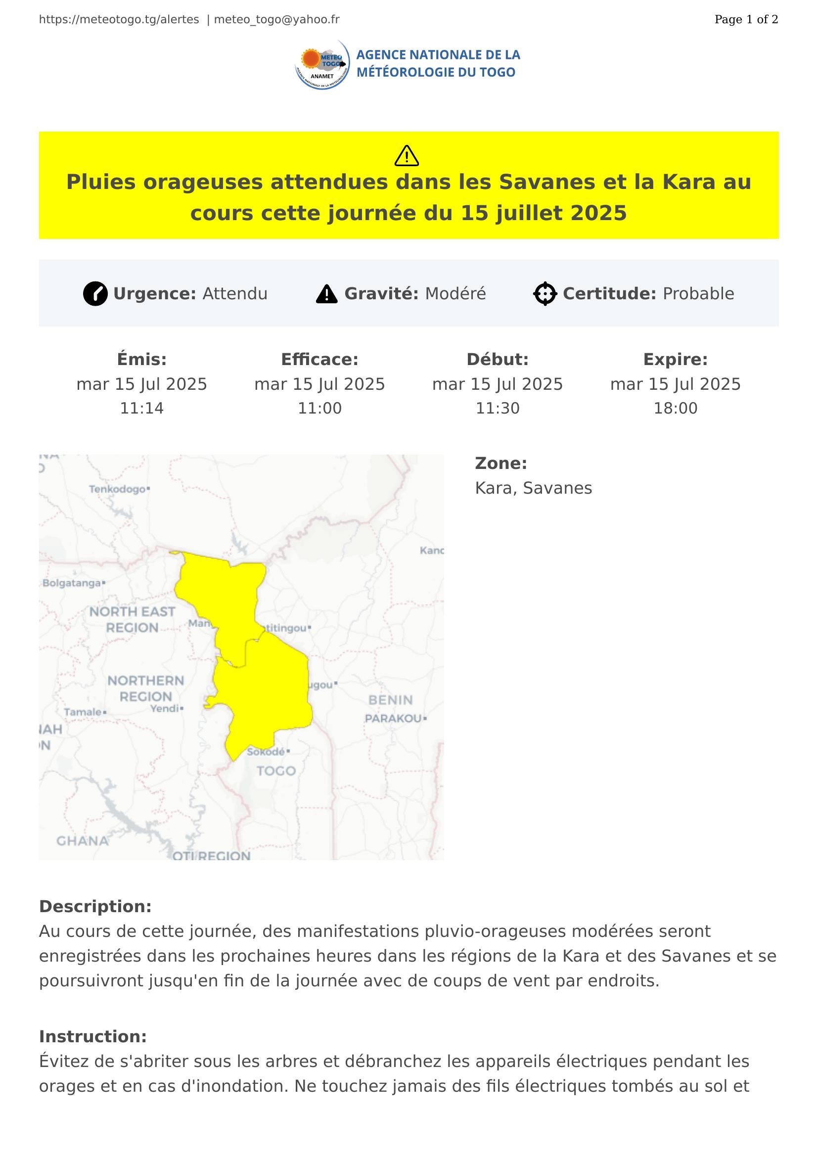 Pluies orageuses attendues dans les Savanes et la Kara au cours cette journée du 15 juillet 2025