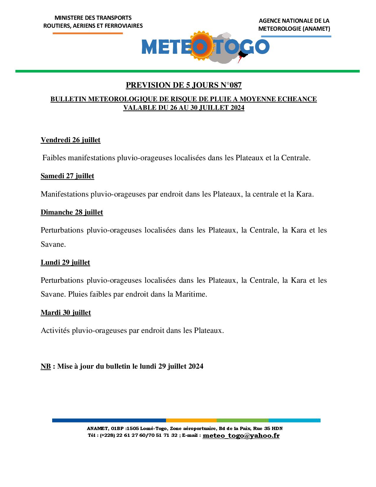 NB : Mise à jour du bulletin le lundi 29 juillet 2024