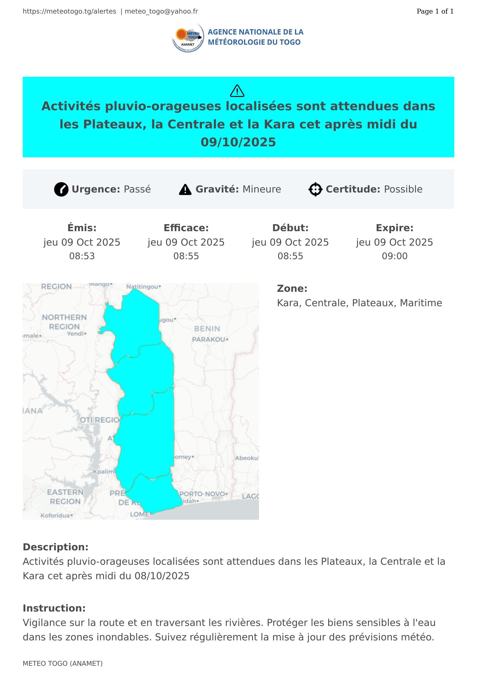 Activités pluvio-orageuses localisées sont attendues dans les Plateaux, la Centrale et la Kara cet après midi du 09/10/2025