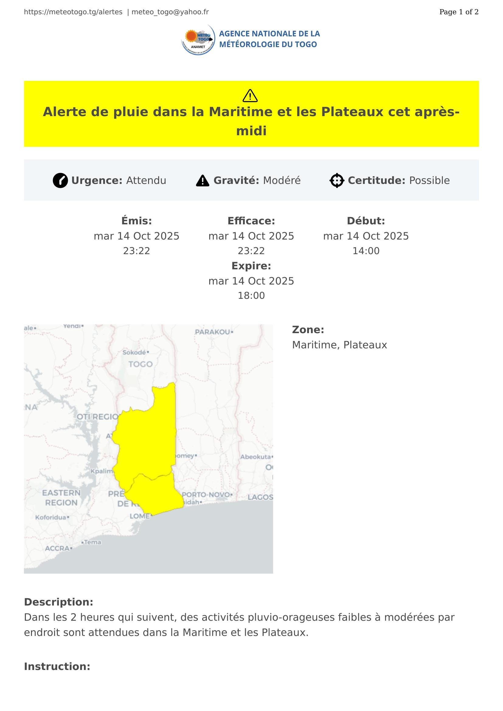 Dans les 2 heures qui suivent, des activités pluvio-orageuses faibles à modérées par endroit sont attendues dans la Maritime et les Plateaux.