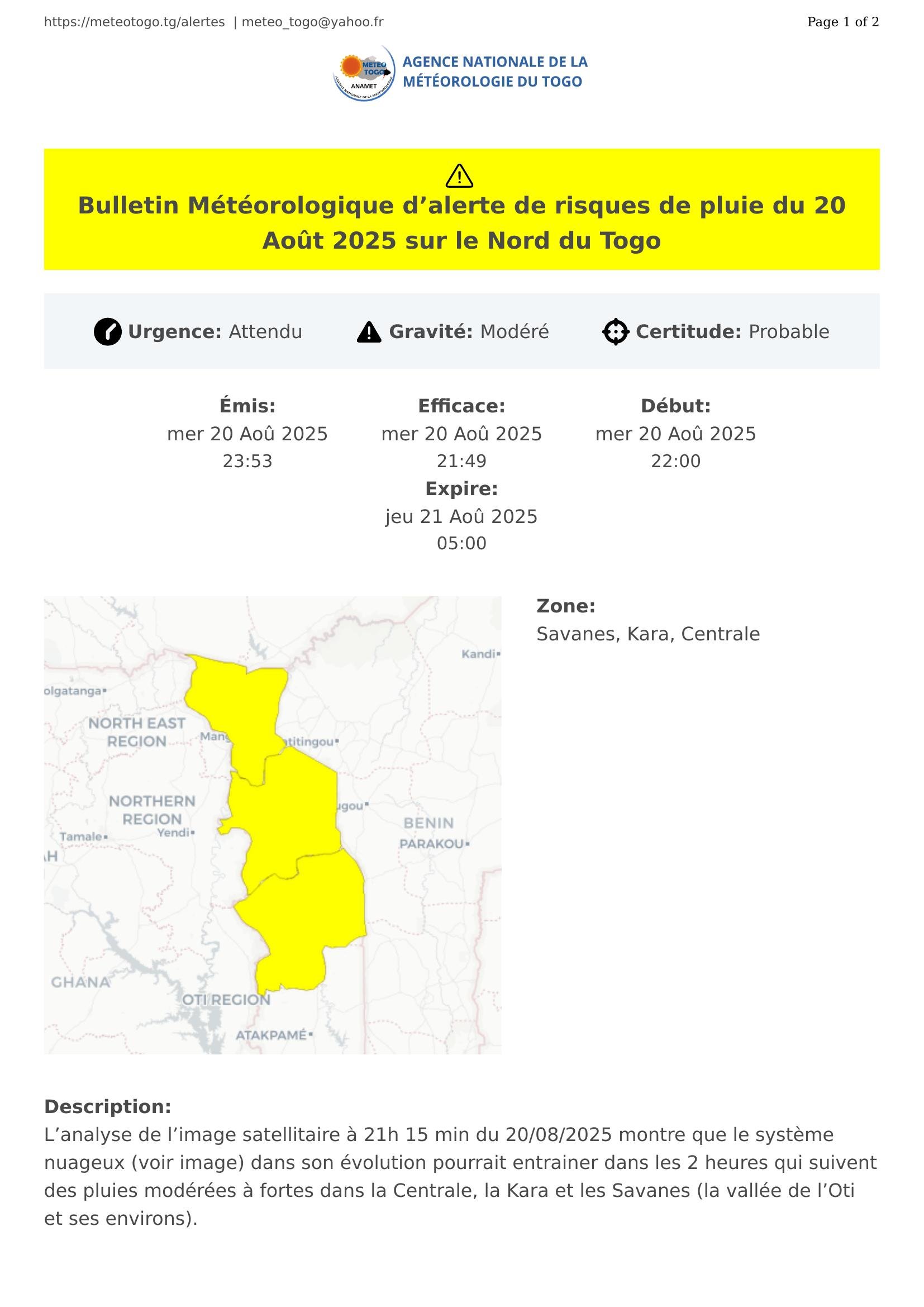 Bulletin Météorologique d’alerte de risques de pluie du 20 Août 2025 sur le Nord du Togo