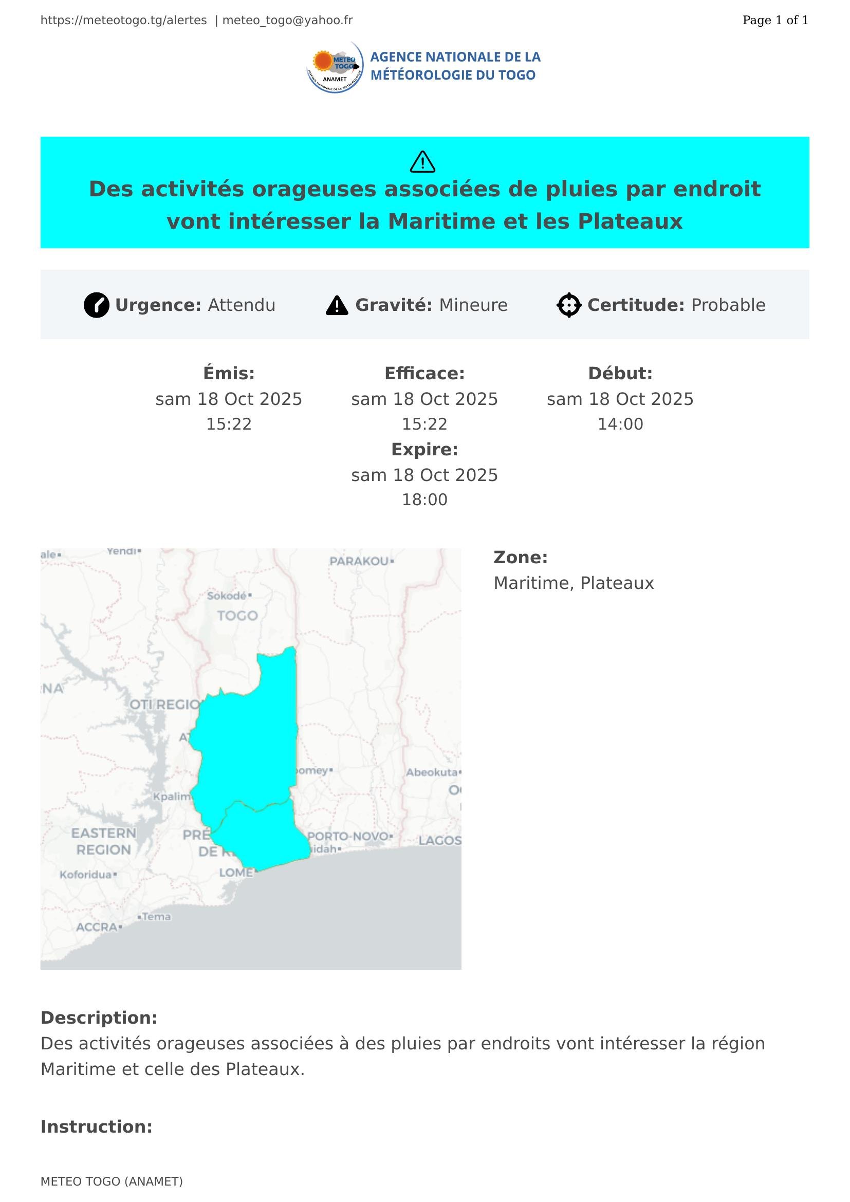 Des activités orageuses associées à des pluies par endroits vont intéresser la région Maritime et celle des Plateaux.