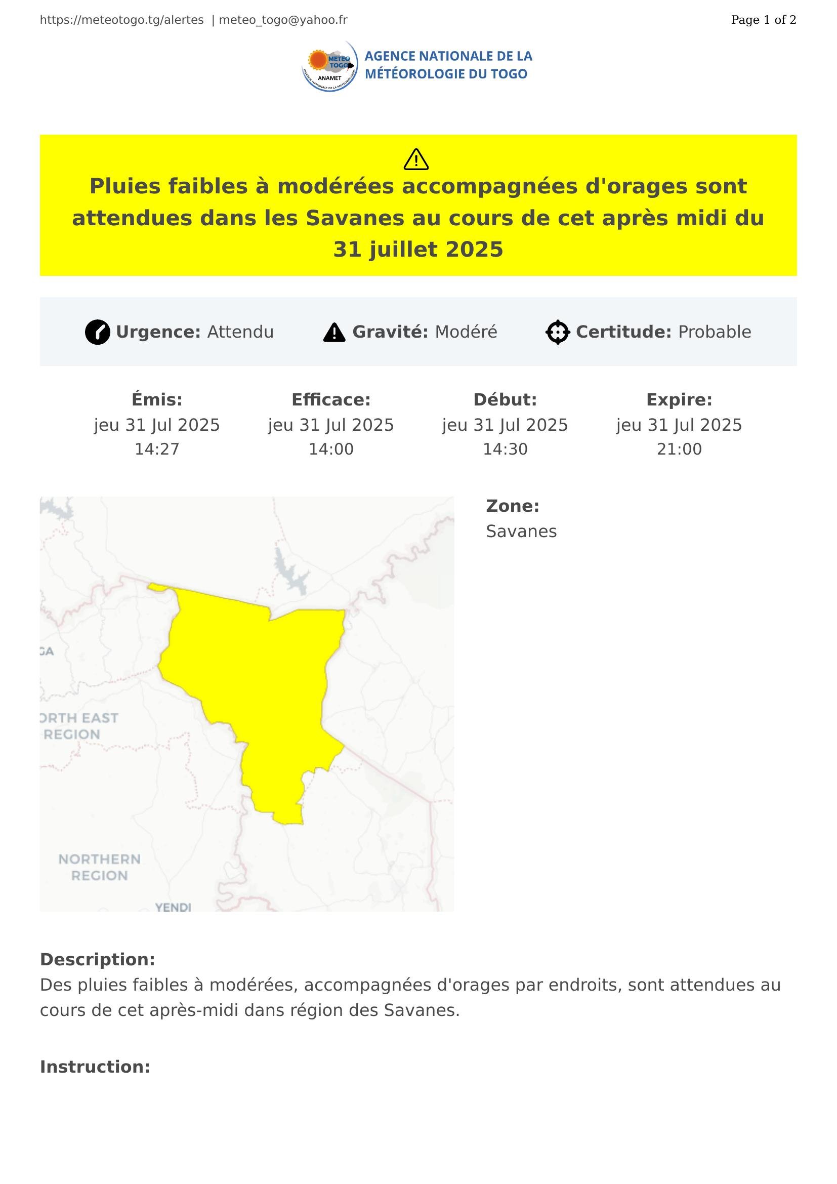 Pluies faibles à modérées accompagnées d'orages sont attendues dans les Savanes au cours de cet après midi du 31 juillet 2025