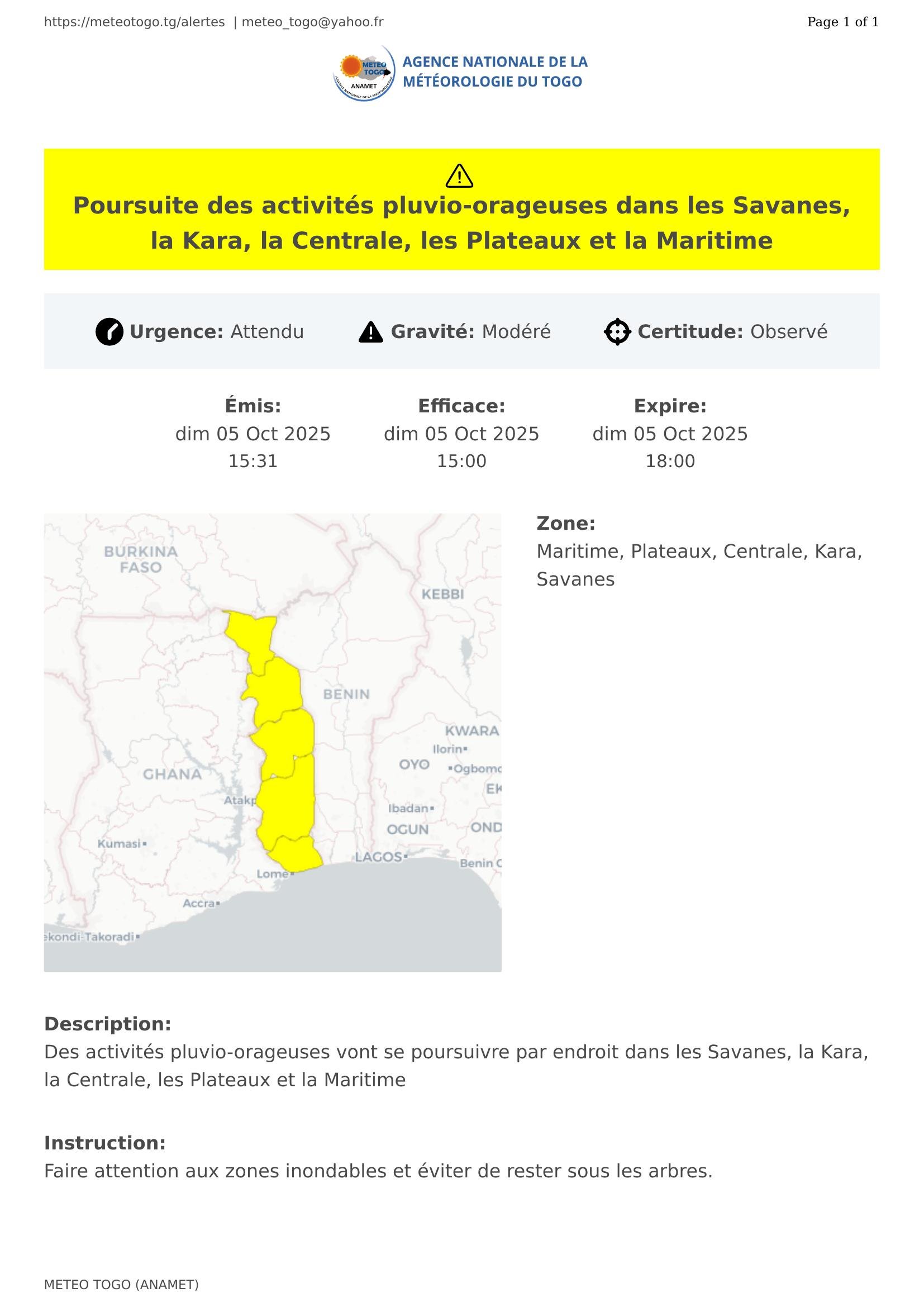Poursuite des activités pluvio-orageuses dans les Savanes, la Kara, la Centrale, les Plateaux et la Maritime